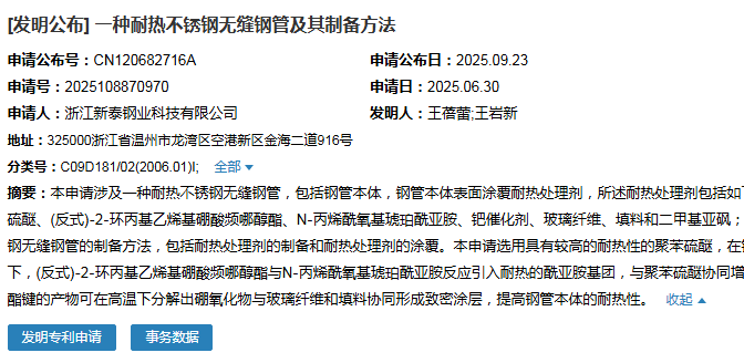 2025年9月23日,浙江新泰鋼業(yè)科技有限公司成功申請(qǐng)一項(xiàng)名為“一種耐熱不銹鋼無縫鋼管及其制備方法”專利,申請(qǐng)公布號(hào)為CN120682716A,申請(qǐng)日期為2025年6月30日。