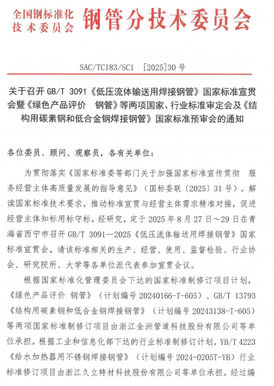 經(jīng)研究,定于2025年8月27-29日在青海省西寧市召開《綠色產(chǎn)品評價(jià)鋼管》和YB/T4223《給水加熱器用不銹鋼焊接鋼管》等兩項(xiàng)國家、行業(yè)標(biāo)準(zhǔn)審定會及GB/T13793《結(jié)構(gòu)用碳素鋼和低合金鋼焊接鋼管》國家標(biāo)準(zhǔn)預(yù)審會。