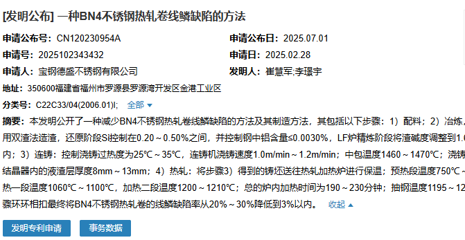2025年7月1日,寶鋼德盛不銹鋼有限公司成功申請一項名為“一種BN4不銹鋼熱軋卷線鱗缺陷的方法”專利,申請公布號為CN120230954A,申請日期為2025年2月28日。